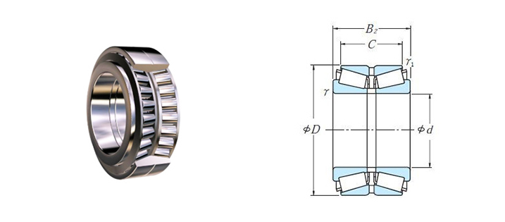 雙列圓錐滾子軸承的外圈或內圈是一個整體,兩個內圈或外圈小端面相近,中間有隔圈,游隙是靠隔圈的厚薄來調整的, 也可用隔圈的厚薄來調整雙列圓錐滾子軸承的預過盈,雙列圓錐滾子軸承通常用于齒輪箱、起重設備、軋鋼機和采礦機械,例如隧道掘進機。